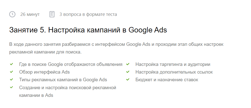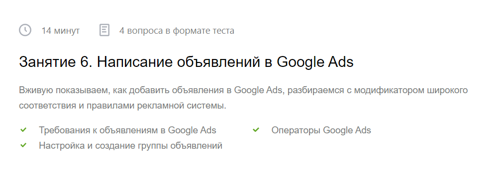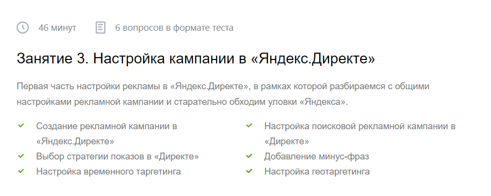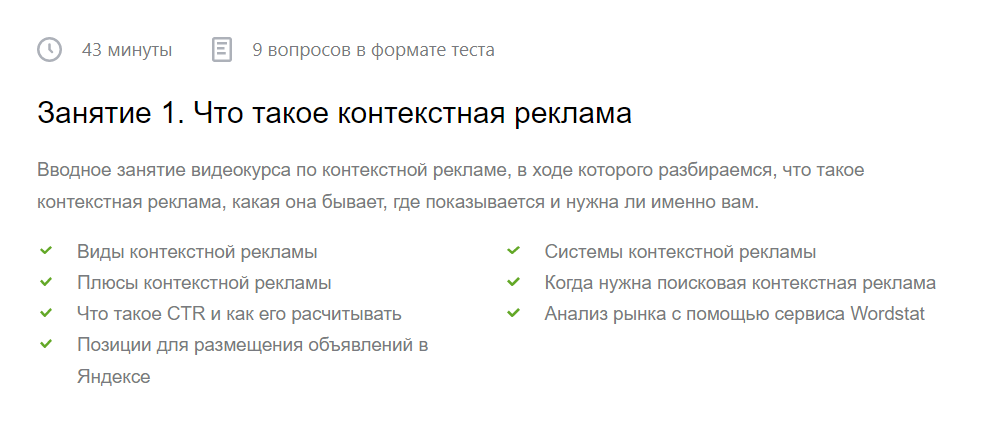 Программа состоит из шести занятий и подходит владельцам бизнеса, маркетологам, начинающим специалистам по контекстной рекламе. Уроки посвящены тому, что такое контекстная реклама и для чего она нужна, а также принципам работы с кампаниями в Директе и в Google Ads.