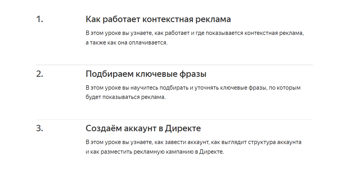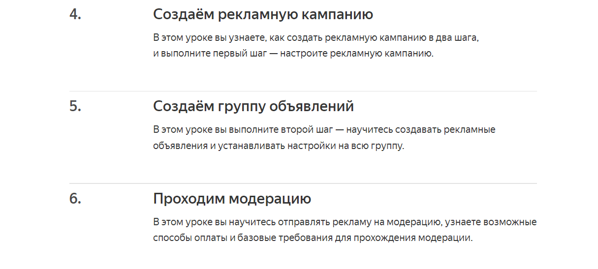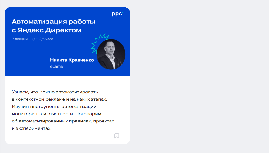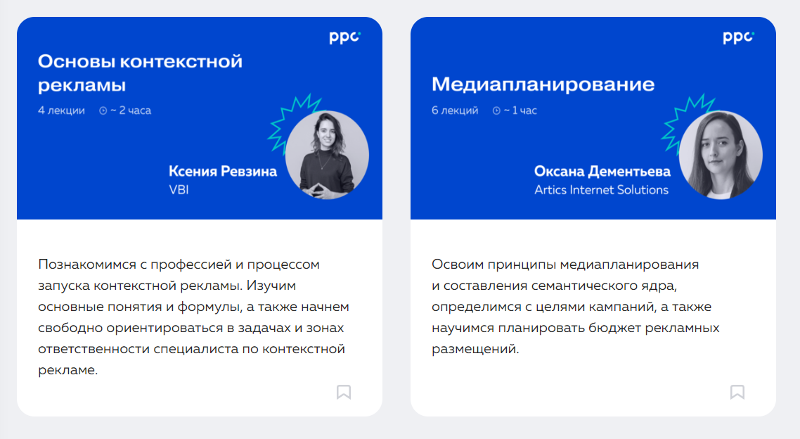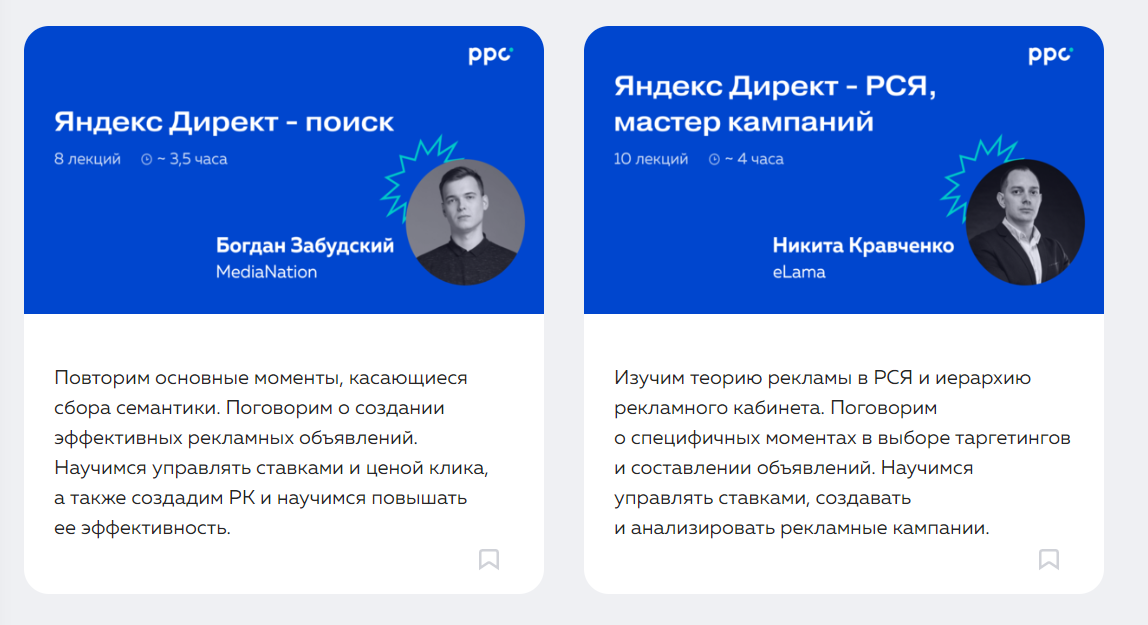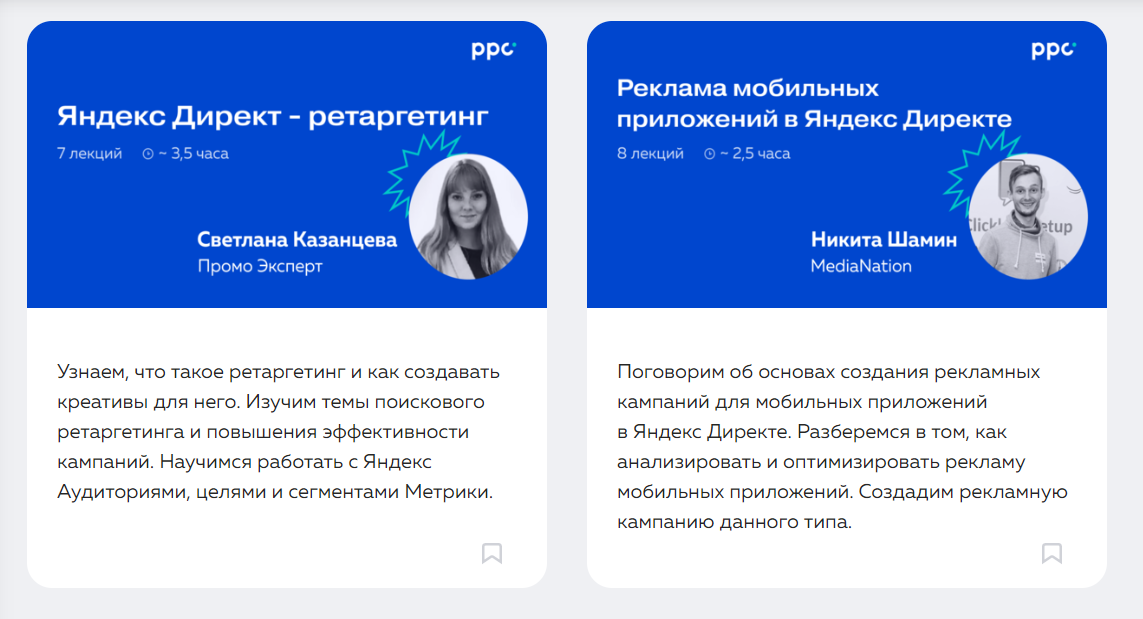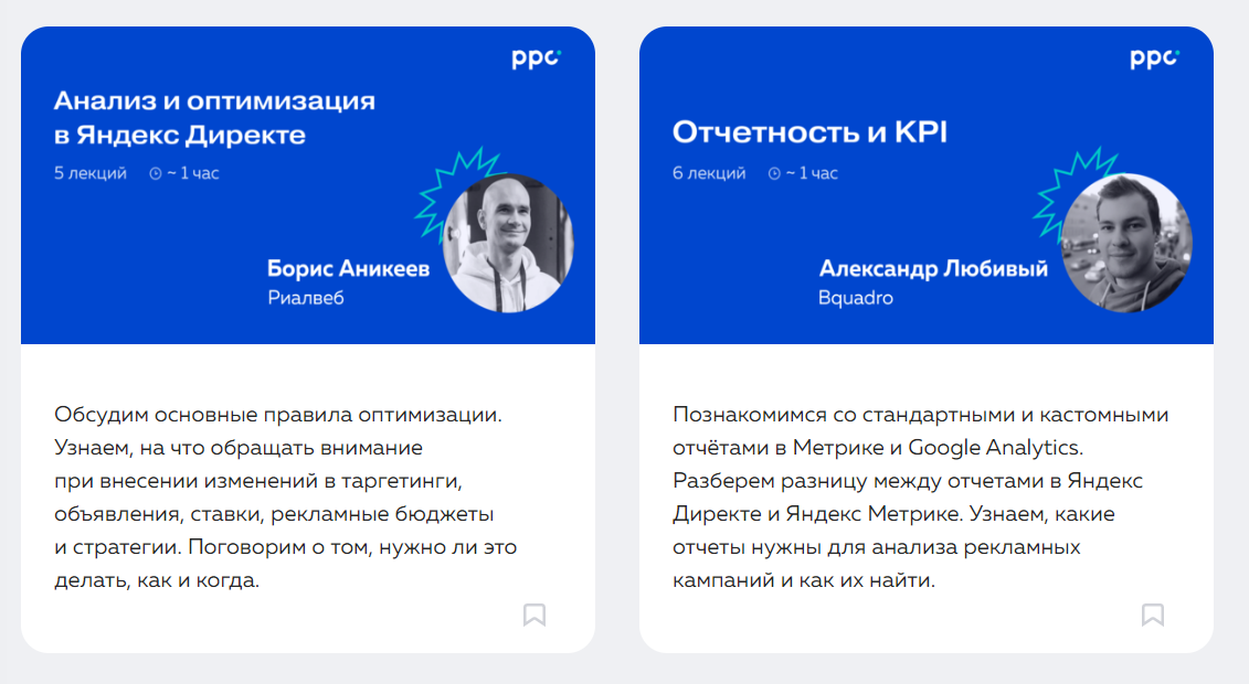 Авторизованные пользователи на ppc.world могут изучить 11 мини-курсов по Яндекс Директу: 4 из них — про подготовку рекламных кампаний, 5 — про запуск и 2 — про анализ. В каждом курсе — от 4 до 10 лекций. Лекции ведут практикующие специалисты ведущих digital-агентств: Artics Internet Solutions, Риалвеб, MediaNation, eLama. Наша команда регулярно обновляет курсы — перезаписывает лекции, которые теряют актуальность. Чтобы просмотреть курсы, авторизуйтесь на ppc.world, зайдите в свой профиль и выберите «Курсы» в левом меню.
