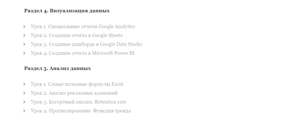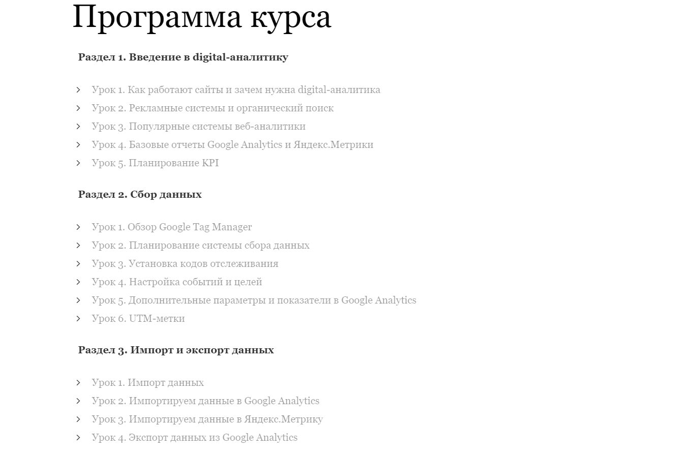 Курс состоит из текстовых лекций по основным разделам digital-аналитики: введение, сбор данных, импорт и экспорт, визуализация и анализ результатов. После лекций — тесты для самопроверки. В ходе обучения вы освоите такие популярные инструменты, как Google Analytics, Яндекс.Метрика, Google Tag Manager и т. п.