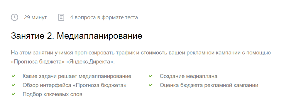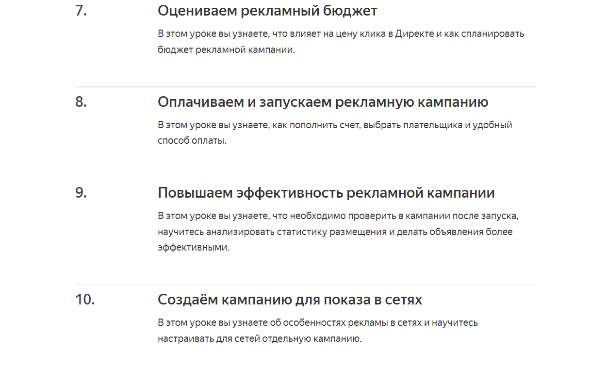 Курс поможет новичкам разобраться, как работает рекламный кабинет Директа, узнать базовую информацию о типах и форматах рекламы, а также настроить свои первые кампании. В курсе 10 уроков, после каждого есть вопросы для самопроверки.