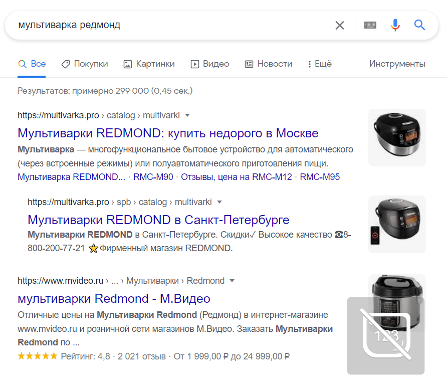 Результаты поиска находятся под рекламой, а ключи выделены жирным шрифтом. Для наглядности смотрите пример ниже.