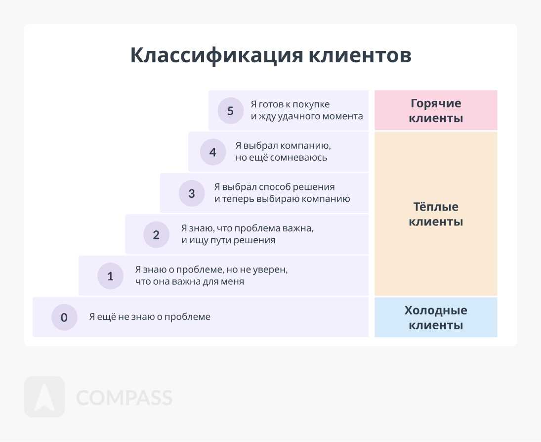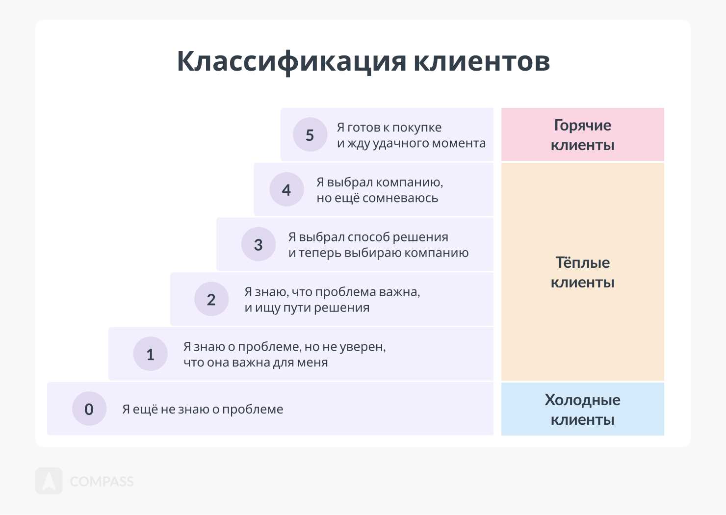 Компания сама определяет, с клиентами какого уровня работать. Можно выбрать только аудиторию с высокой степенью готовности к покупке, либо ориентироваться на всех потенциальных клиентов, включая холодных.