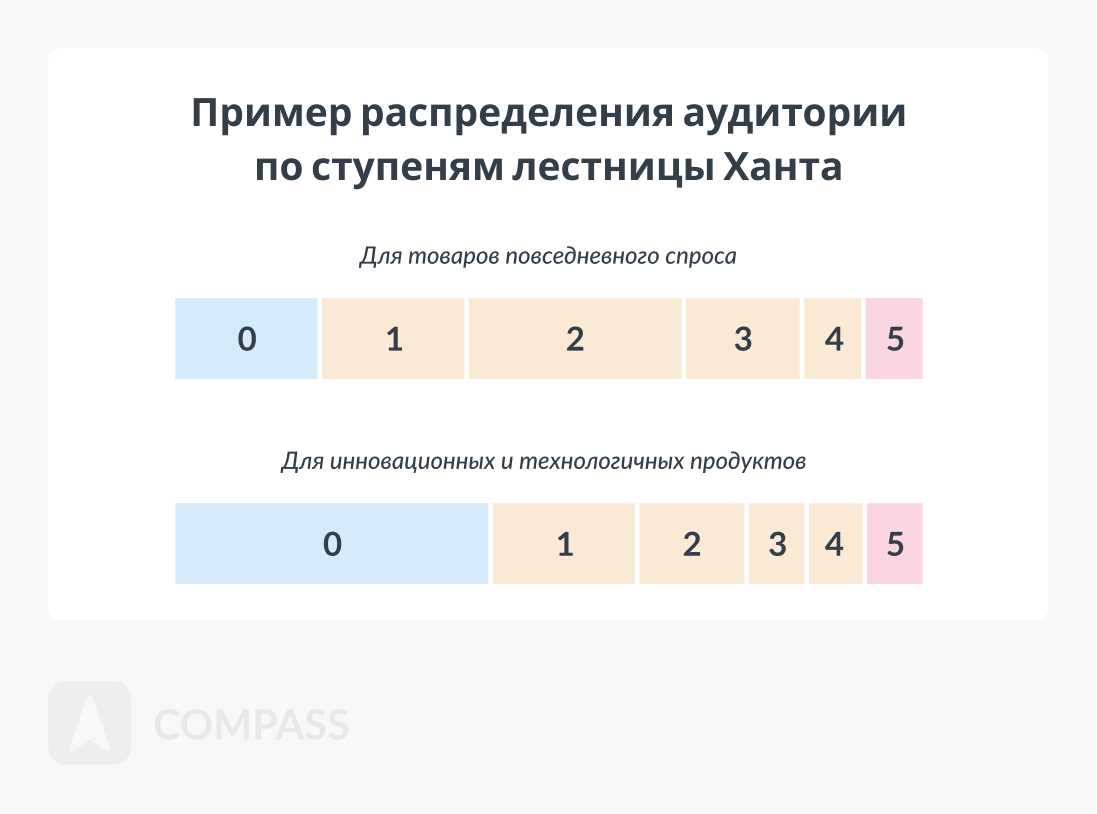 Если провести исследование и оценить количество ваших потенциальных клиентов на каждой ступени лестницы Ханта, а также примерно посчитать бюджет на привлечение каждой категории людей, можно принять взвешенное и осознанное решение о том, с какими типами клиентов стоит работать в первую очередь.