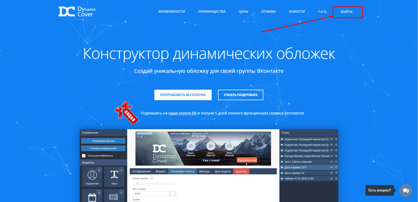 Первым делом после того так вы перешли на сайт вам нужно войти. Для этого просто жмем кнопку. Вход на сайт осуществляется через соц. сеть ВК, разрешаем сервису доступ к данным. Затем открываем конструктор