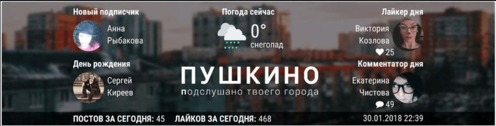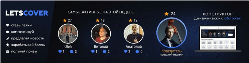 Пожалуй, самый востребованный блок динамической обложки для группы Вконтакте. С его помощью можно транслировать любую активность. В шапке паблика появляется фото новых пользователей, лучших комментаторов, людей, которые сделали больше всего лайков или репостов. Это отличный способ оживить аудиторию, нарастить подписную базу конкурсами и поднять сообщество выше в органической выдаче.