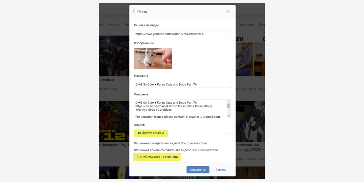 Затем добавьте ссылку на страницу видеозаписи. Учтите, что ВКонтакте поддерживает загрузку видео не со всех сайтов