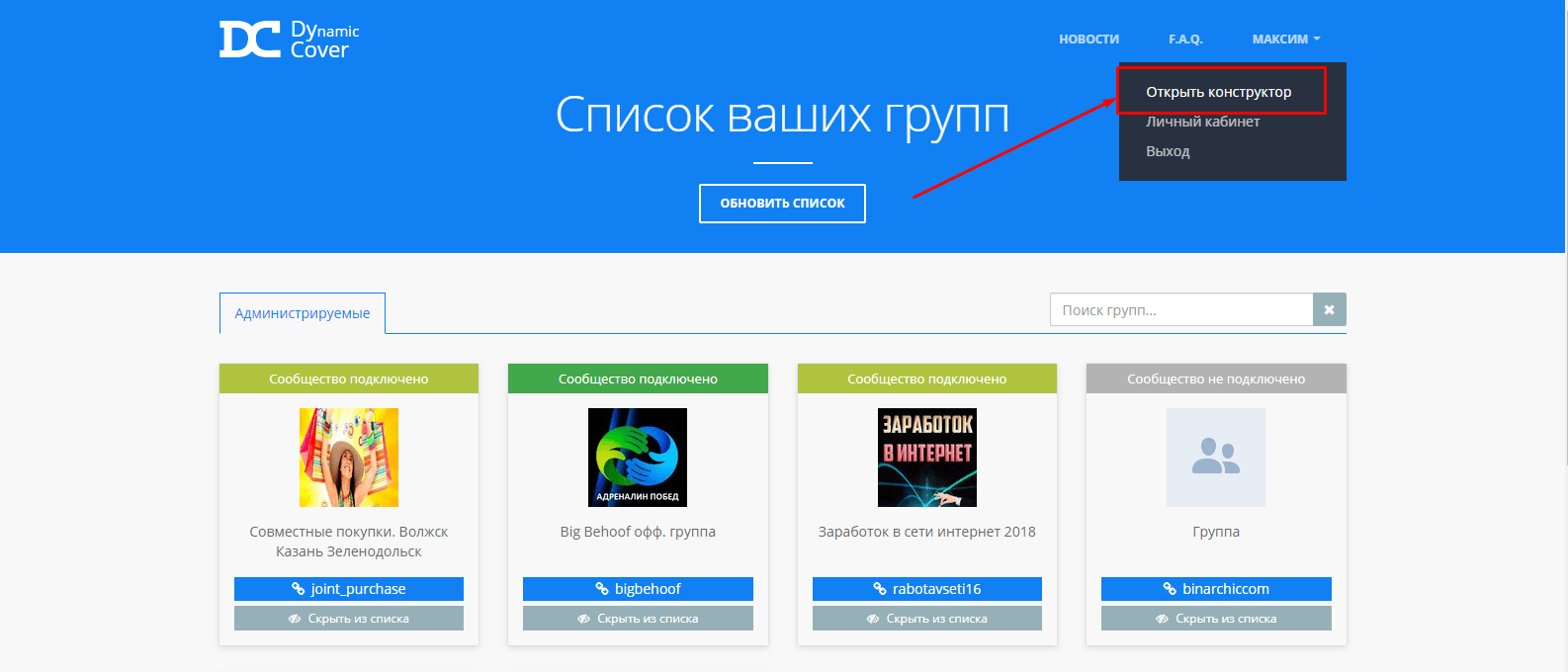 В конструкторе появятся все группы ВК в которых вы являетесь администратором. Если какая то группа не отобразится нажмите кнопку «обновить список»