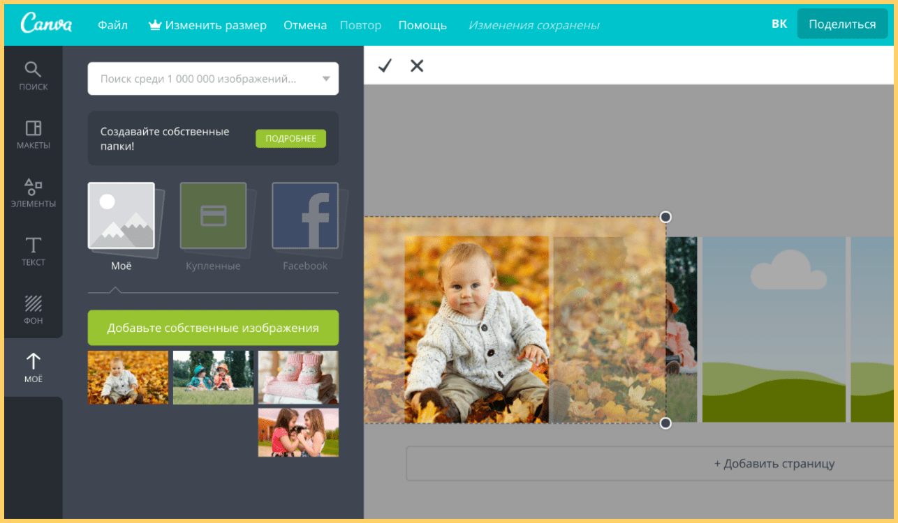 Чтобы вставить загруженное изображение в новый макет, просто перетащите его мышкой вправо и расположите в нужной части сетки. Здесь фото можно «кадрировать» — то есть расположить внутри выбранного окошка нужным образом и в нужном масштабе.