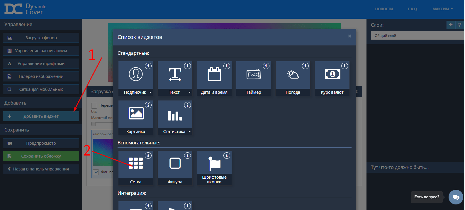 Что бы было удобнее работать устанавливаем сетку. она не будет видна на готовой обложке, но позволит легко размещать другие виджеты на ней. Что бы включить сетку в меню слева жмем кнопку «Добавить виджет»