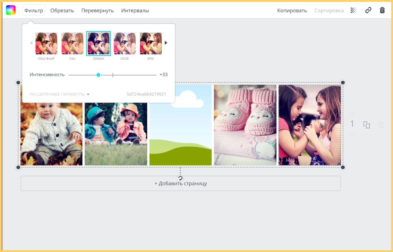 В нашем примере мы наполнили четыре поля для фотографий, кроме центрального, кадрами и применили ко всем из них один и тот же фотофильтр, чтобы привести фотографии к «единому знаменателю» — так они будут лучше смотреться вместе.