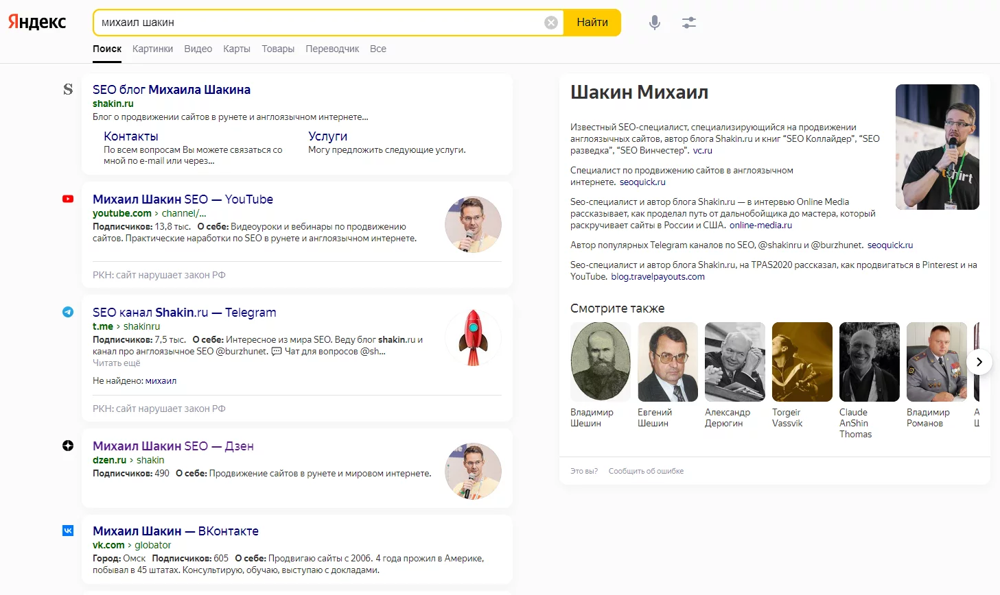 Михаил Шакин, эксперт по SEO-продвижению с раскрученным личным брендом. В Яндексе у него есть специальная именная карточка