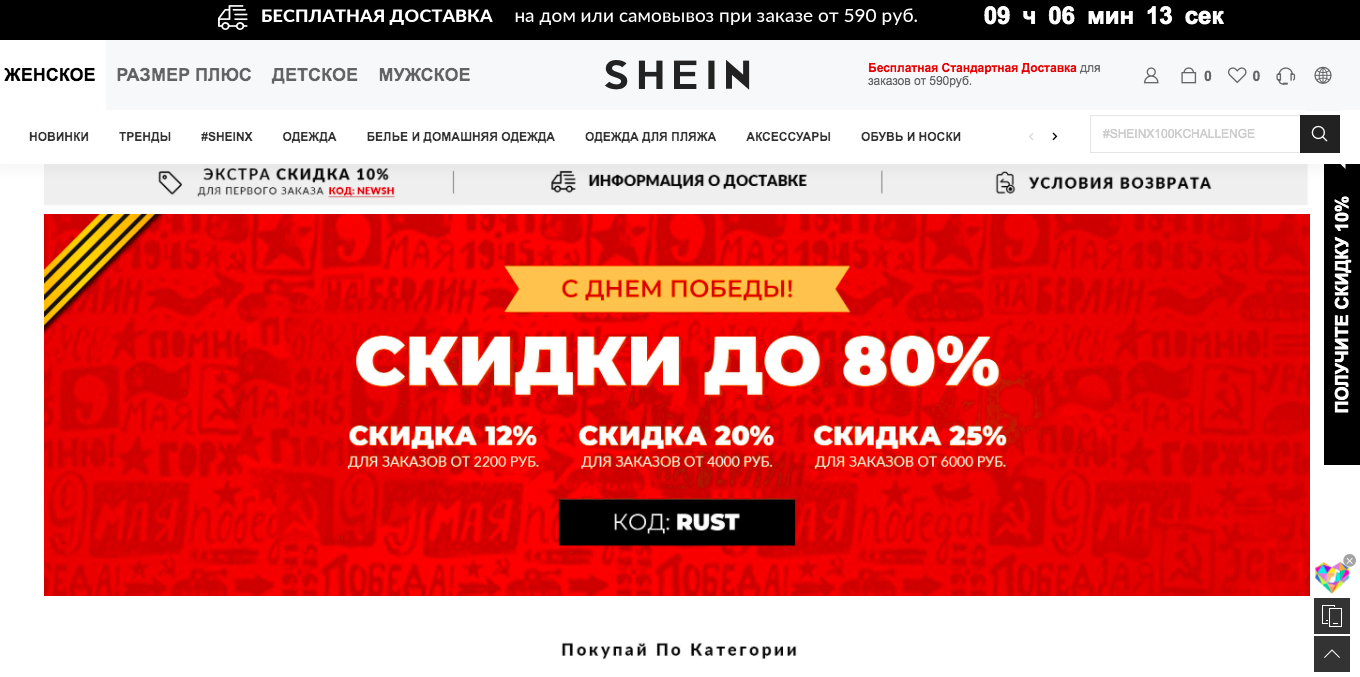 Пример лид-магнита для интернет магазина — баннер на главной странице SHEIN ко Дню Победы. На сайте магазина часто можно увидеть подобные баннеры к различным праздникам.