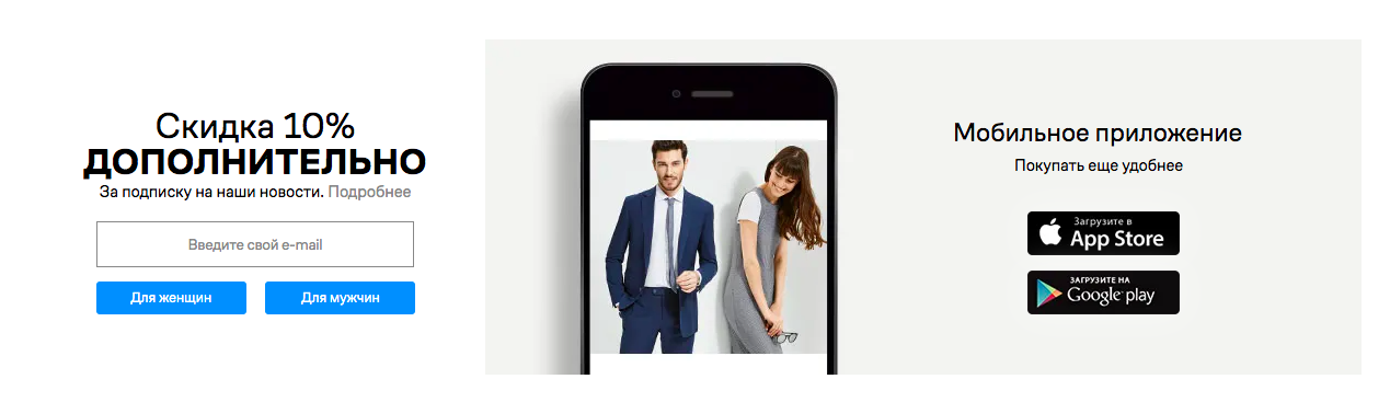 Lamoda предлагает дополнительную скидку на покупки для тех, кто подпишется на новости бренда.