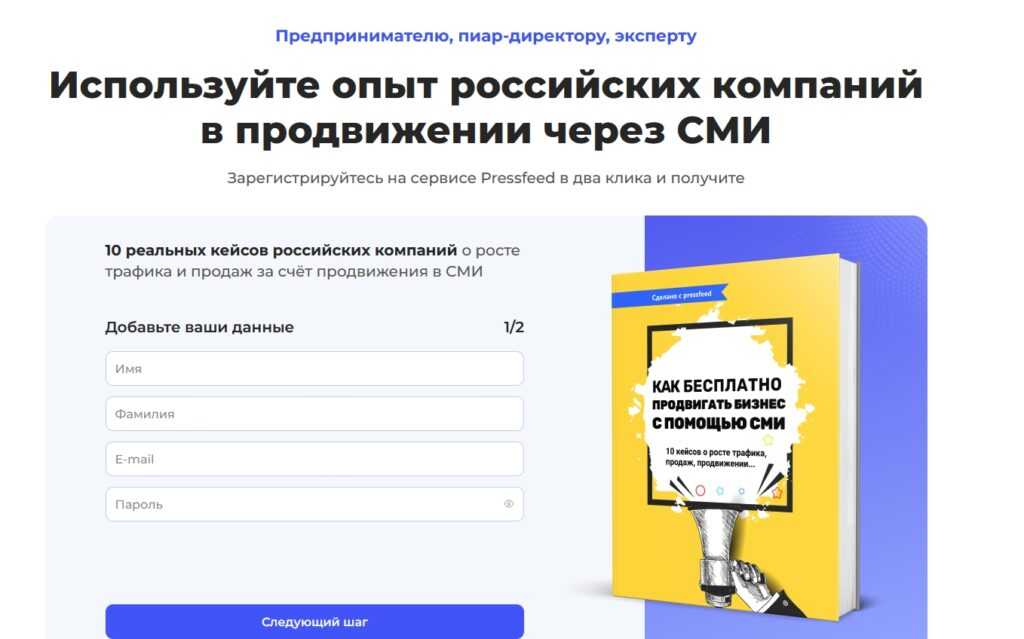 Наш сервис журналистских запросов Pressfeed предлагает несколько бесплатных электронных книг, среди них, например, есть такая — «Как бесплатно продвигать бизнес с помощью СМИ». На лендинге показано, для кого эта книга и что читатель увидит внутри нее. Получить ее можно после быстрой регистрации на сервисе.
