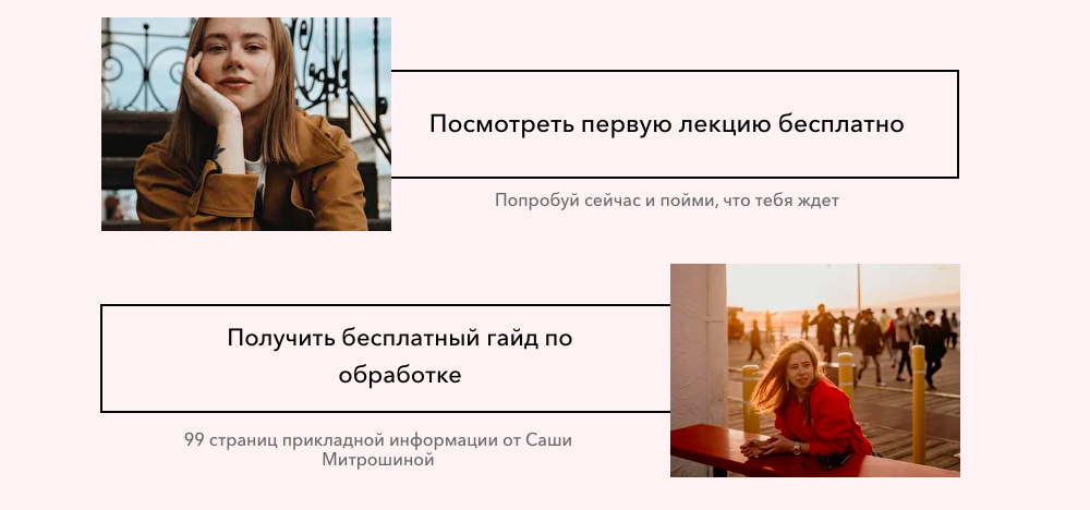 На сайте с проектами Саши Митрошиной можно найти довольно много бесплатных материалов. Вот один из примеров — лид-магниты к курсу «Визуал наповал». Кстати, можете взять на заметку — у всех материалов качественное и красивое оформление, есть чему поучиться и вдохновиться.