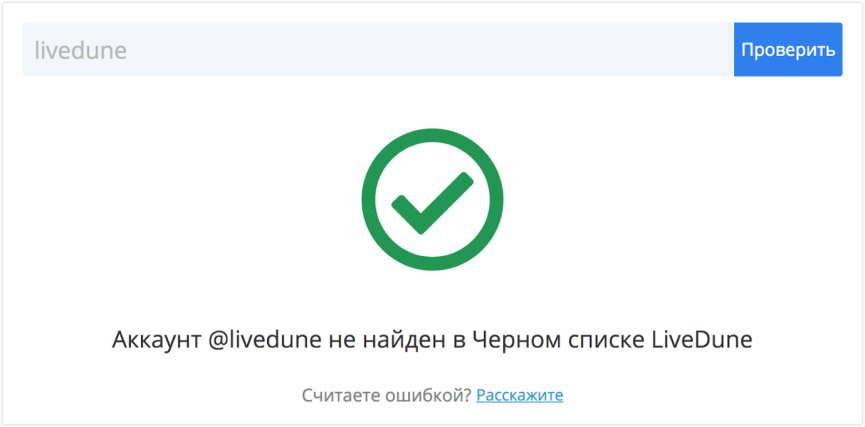 Чтобы воспользоваться сервисом, достаточно ввести в поисковую строку имя пользователя. Если аккаунта в черном списке нет, появится зеленая галочка: