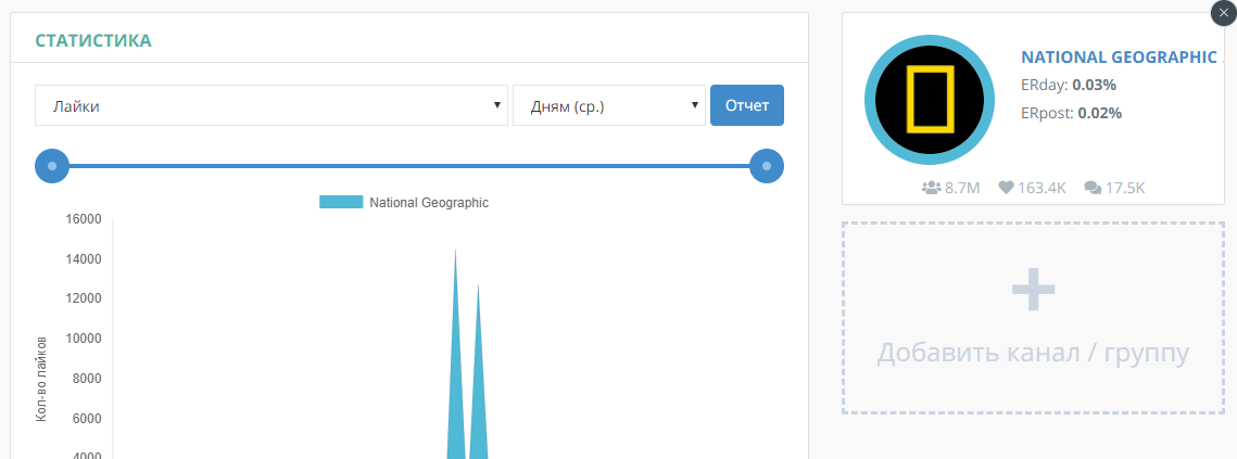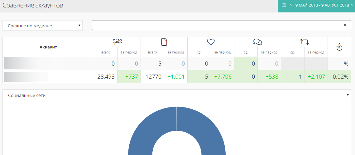 Инструмент позволяет сравнивать профили (даже из разных соцсетей) по основным показателям активности аудитории (подписчики, лайки, репосты, вовлеченность и т.д.):