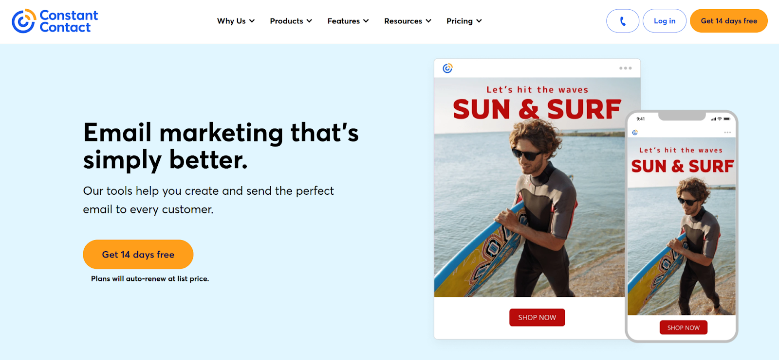 Constant Contact — сервис массовой емеил-рассылки, который идеально подходит для малых бизнесов и юридических лиц. Его ценят за простоту и удобство, поэтому это отличный выбор для новичков.