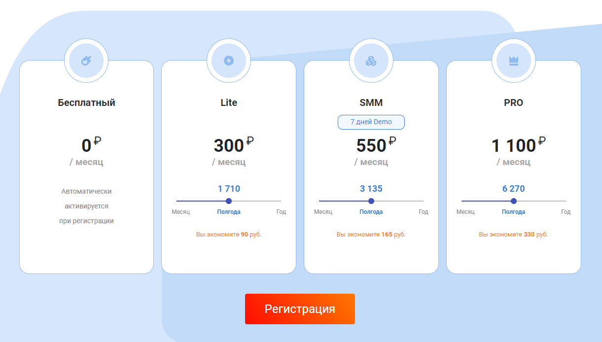 Еще один российский сервис, с помощью которого можно планировать публикацию постов любого формата — от историй до видео. Подписка на LikePro стоит от 349 рублей в месяц. Цена зависит от количества подключенных аккаунтов — можно добавить от 5 до 500 аккаунтов. Максимум, сколько придется заплатить за месячную подписку — 15 049 рублей. Всем, кто зарегистрируется, на семь дней дают бесплатный пробный доступ.