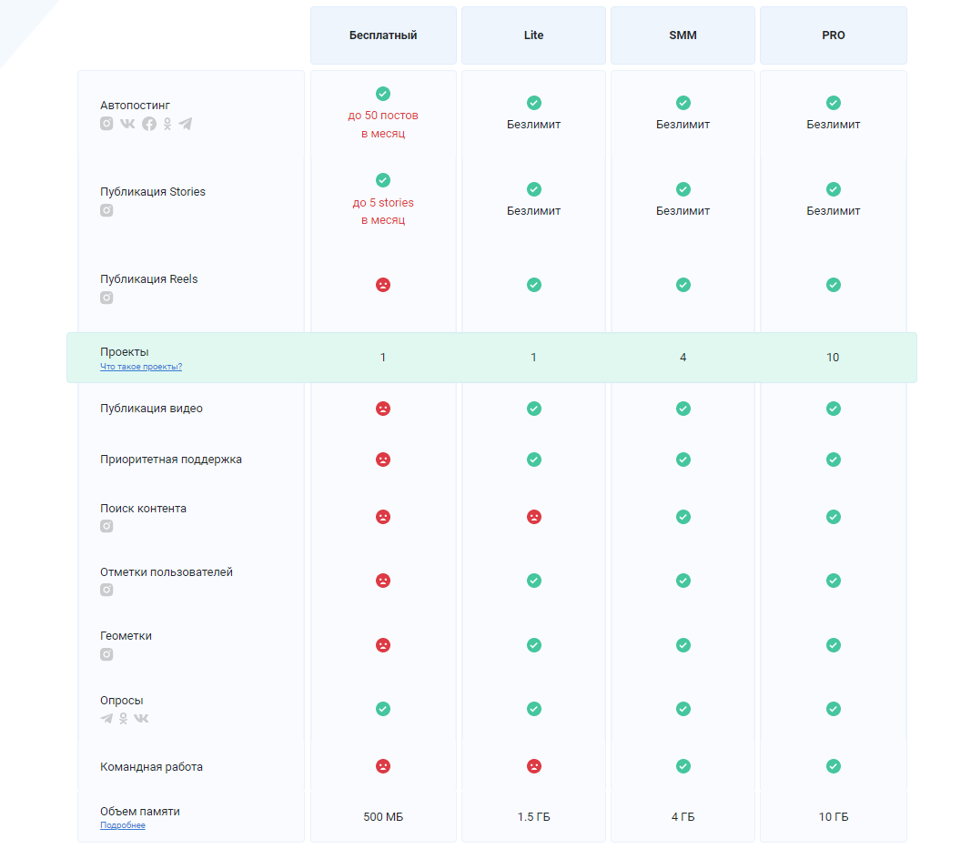 Этим российским сервисом можно пользоваться бесплатно всем, кто размещает не больше 50 постов и пяти историй в месяц. Остальным придется доплатить — подписка на месяц стоит от 300 до 1100 рублей. Зато в платной подписке добавляется больше функций, таких как публикация видео и Reels, добавление геометок и упоминаний пользователей.