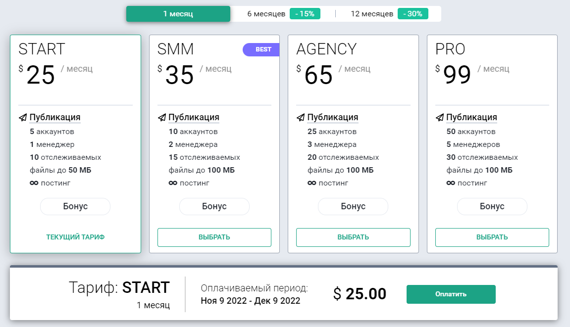 - S: предусмотрено подключение 5 страниц, неограниченное количество постов, 1 рабочее место, 1 проект и базовая аналитика с отчетами на почту. Цена: 15 $ в месяц;