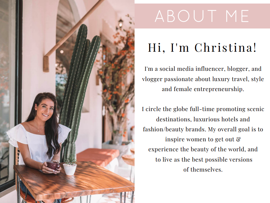 Take a look at how online educator, travel blogger, and influencer Christina Galbato manages to easily introduce herself, her brand, and business goals in a couple of sentences!