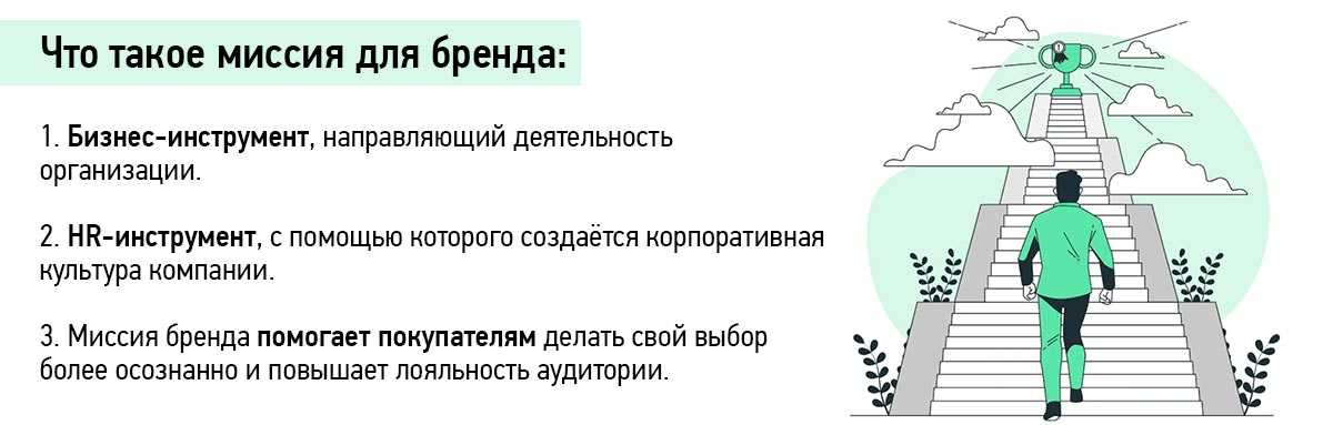 Это высший смысл, положенный в основу существования чего-либо. Как правило, миссию бренда формулируют владельцы бизнеса, исходя из того, что представляется им наиболее значимым и важным, т.е. на основе собственных установок и ценностей. Нередки случаи, когда именно они вдохновляют предпринимателя на создание продукта, помогающего достичь его идеалов.