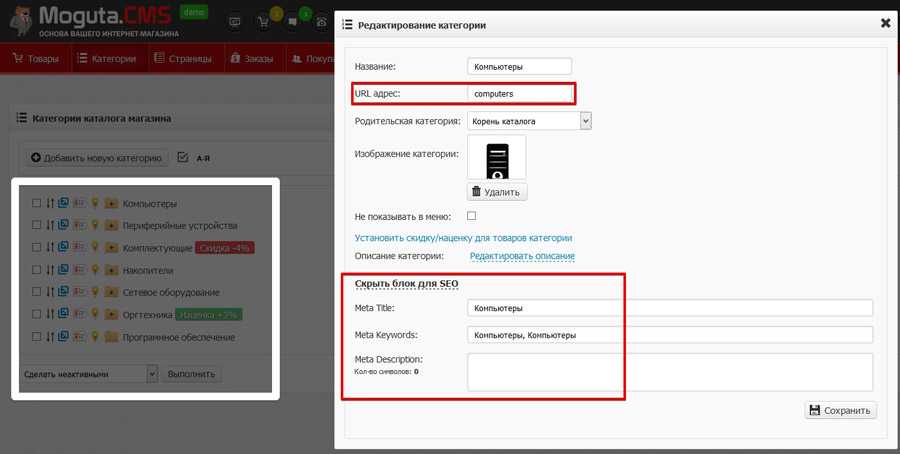 Стоить отметить удобство редактирования Категорий товаров, в которых сразу задается URL адрес и в отдельной вкладке Meta Title и Meta Description.