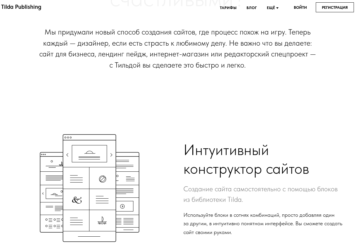 Наиболее известный в РФ сайтбилдер. Помогает создавать одностраничные ресурсы различного формата с набором высокофункциональных модулей (в первую очередь для организации веб-торговли) и предоставлением хостинга. Каталог шаблонов достаточно обширен, есть интеграция со сторонними CRM, помимо собственной Tilda CRM.