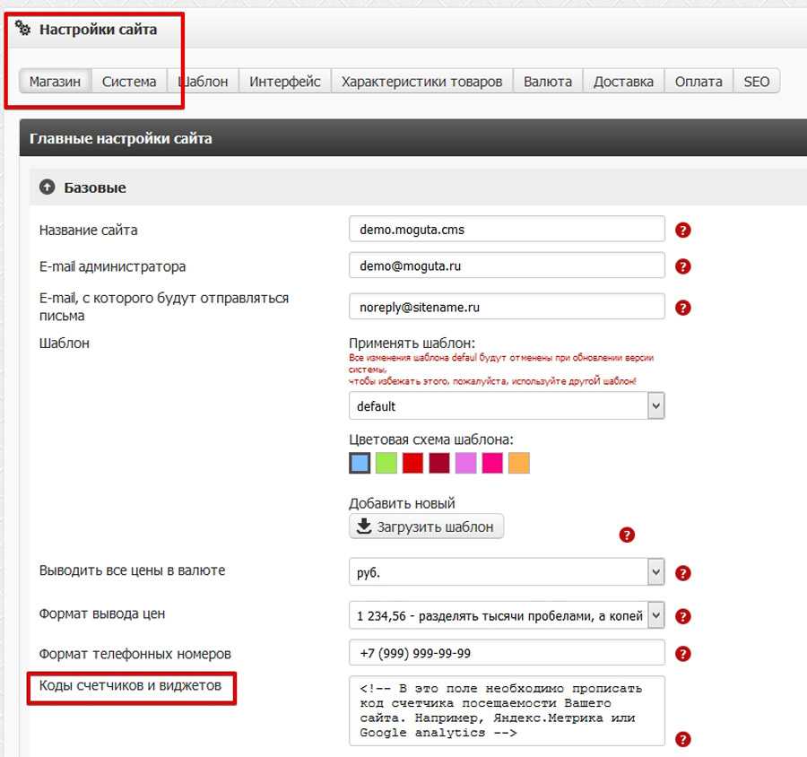 Явным плюсом для многих пользователей данного движка будет простое и удобное добавление счетчиков посещаемости. Делается это в меню Настройки — Магазин, все счетчики добавляются в одном месте, и не нужно копаться в шаблонах сайта.