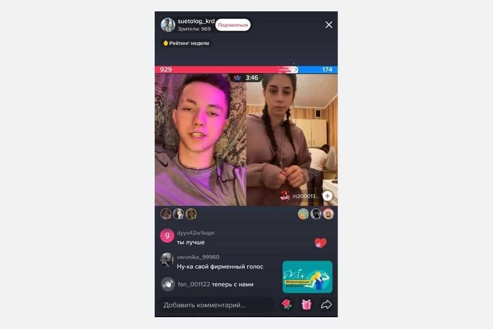 Формат прямого эфира в ТикТоке, когда два блогера подключаются на один экран и получают от зрителей призы. Выиграет тот, кто получит больше всего подарков. Темой баттла может быть что угодно: просто разговор или словесная игра.