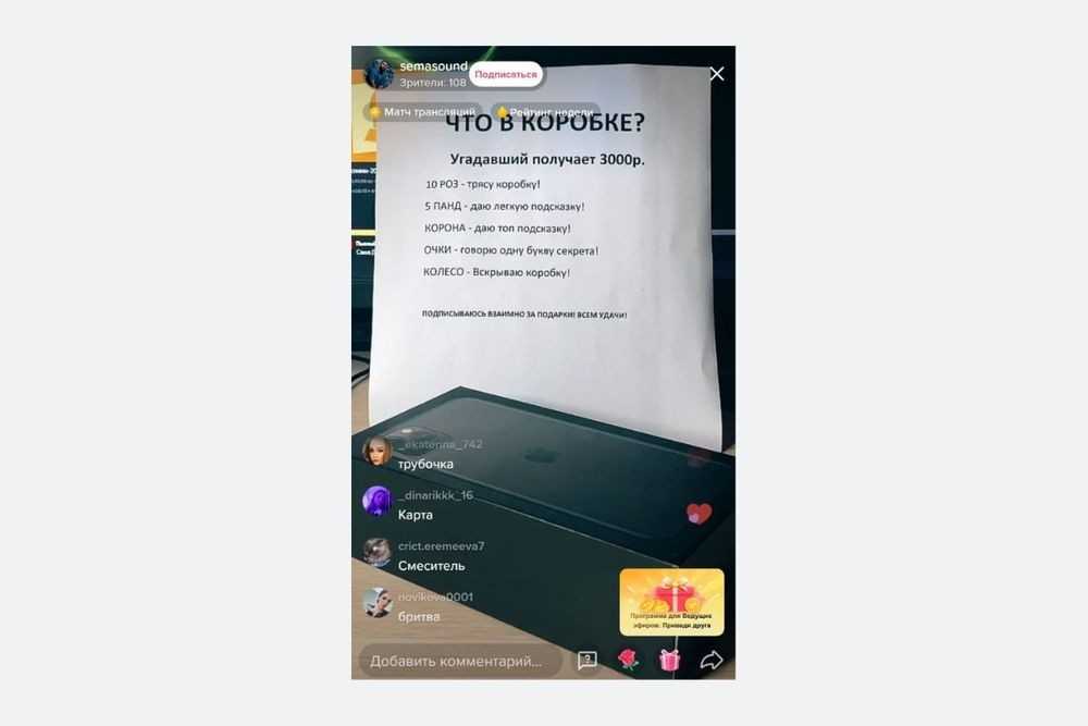 Один из самых простых форматов для монетизации прямых эфиров – прячем вещь в коробке и предлагаем зрителям отгадать, что в ней. Победителю – приз. С помощью подарков можно сделать прайс-лист для действий. Например, за 10 «роз» ведущий стрима потрясет коробку, а за «корону» – скажет первую букву или назовет свойство предмета.