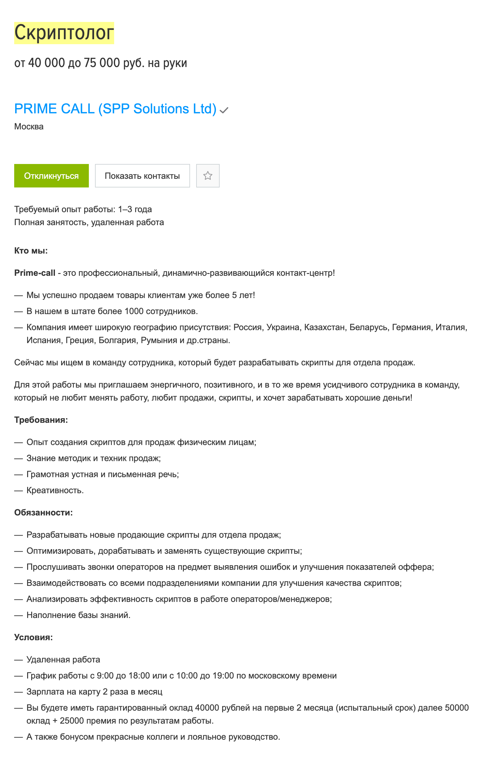 Когда я писала эту статью, на «Хедхантере» была лишь одна вакансия скриптолога