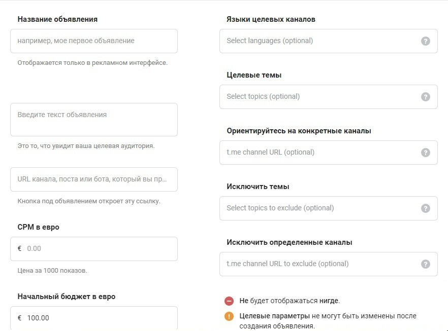 Ключевой минус такого способа является отсутствие настройки таргета на конкретных людей, поэтому рекламный бюджет может быть потрачен впустую. Будьте аккуратны и не забывайте сначала проводить тесты на небольшие суммы. Несмотря на это, в настройке рекламных постов можно выбирать тематику канала, на котором будет публиковаться сама реклама; примеры конкретных каналов; исключения в виде каналов.
