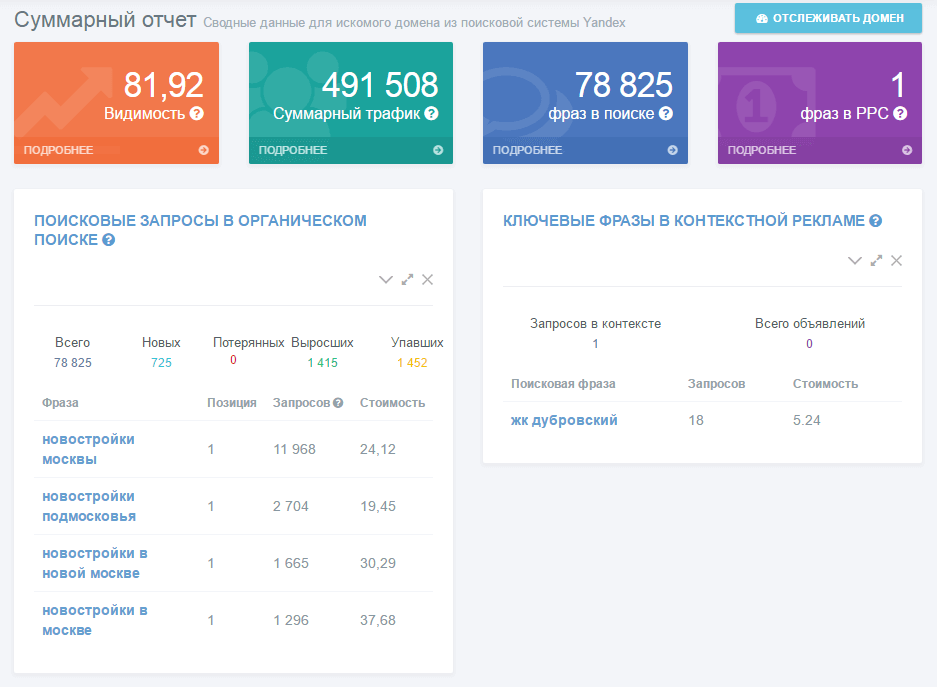 У этого сайта много поисковых фраз, по которым он ищется, а также отличные позиции по частотным целевым фразам («новостройки москвы» и пр.).