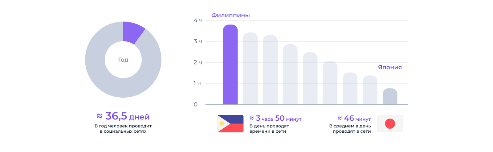 49% всего населения земли пользуются социальными сетями. Из них 63% — это лица старше 13 лет. В среднем, человек проводит 2 часа 50 минут в соцсетях.
