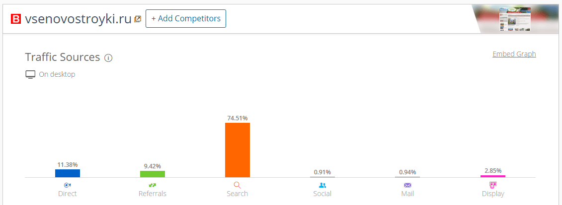 Кроме того, в SimilarWeb тоже можно посмотреть примерное распределение трафика по источникам. Это может помочь в том случае, если у вас вообще нет доступа к статистике, но необходимо сделать беглую оценку.