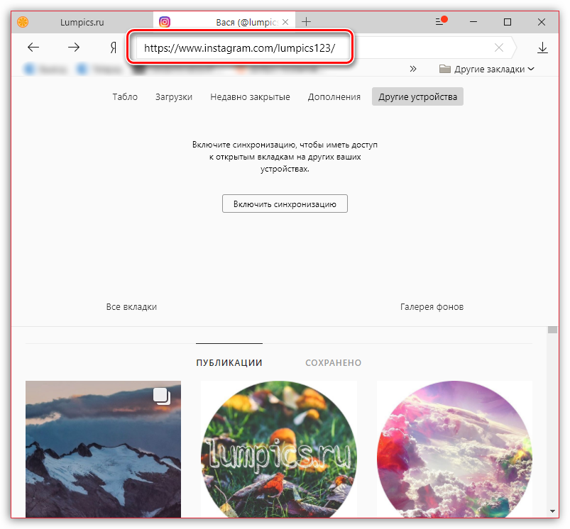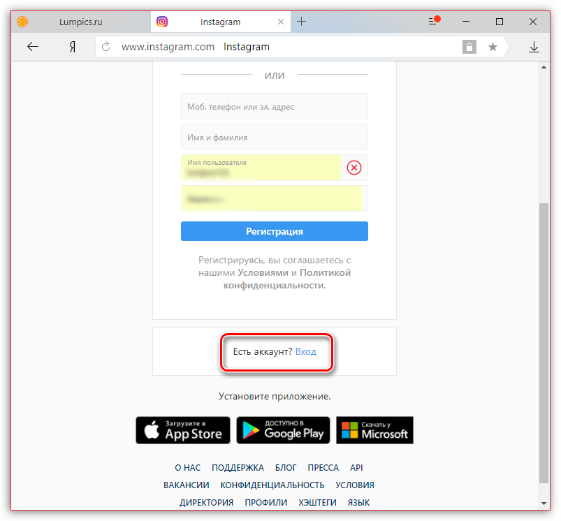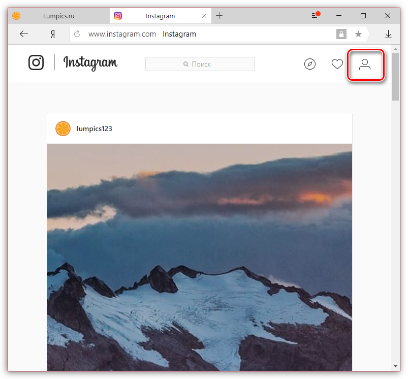 - Перейдите в любом браузере на компьютере или смартфоне на сайт сервиса Instagram. При необходимости, кликните по кнопке «Вход», а затем авторизуйтесь для входа в профиль.