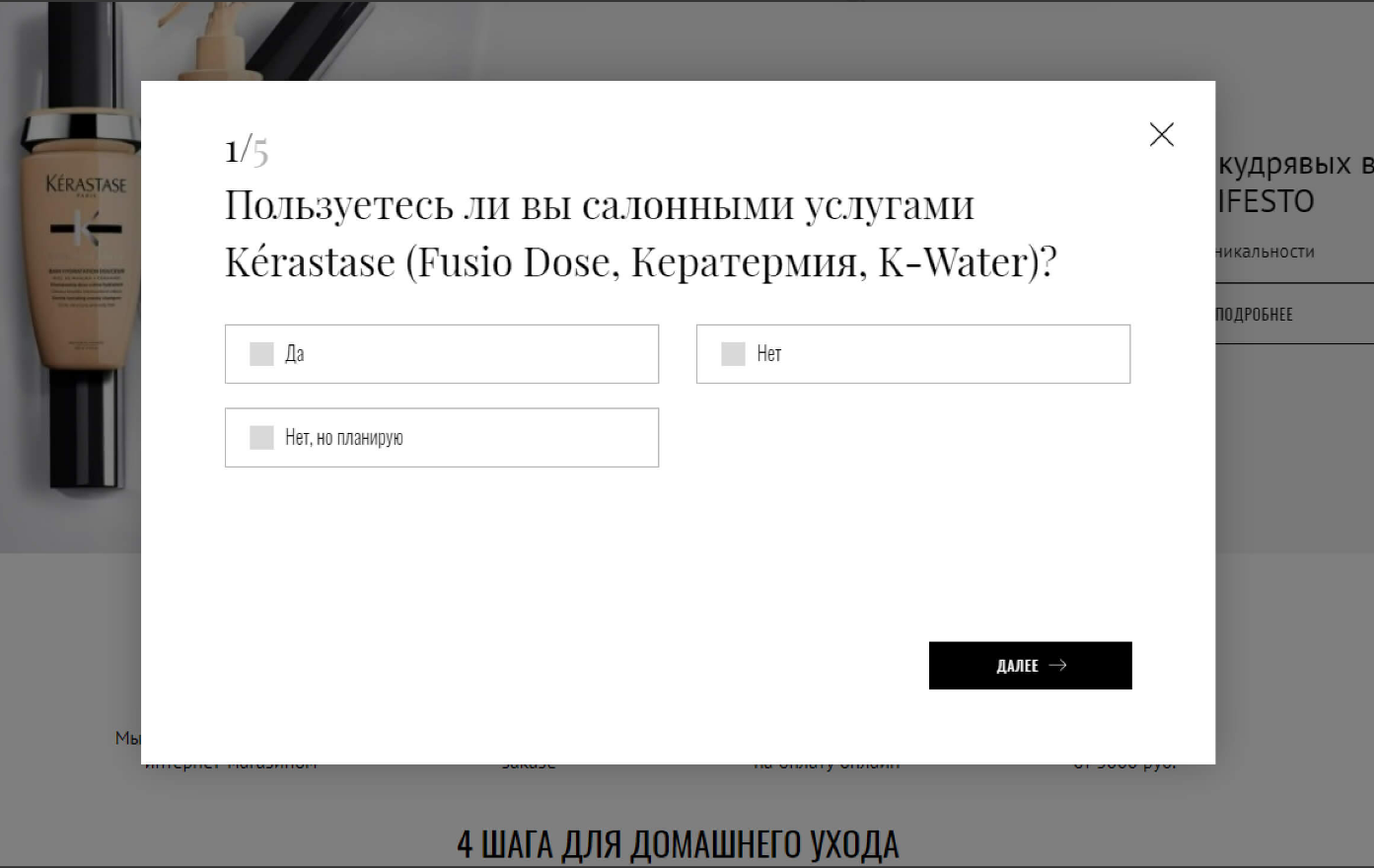Виджет опроса на сайте kerastase.ru. Шаг 1