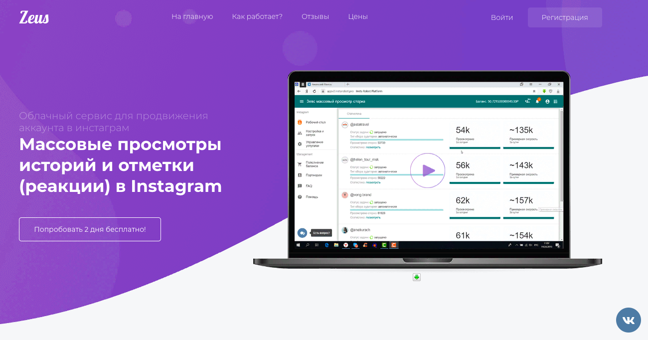 У этого сервиса также есть пробный бесплатный период — 2 дня. Функции Zeus — массовый просмотр историй (масслукинг) и реакции на них. Есть два варианта тарифа — стандарт и вип. Стоимость зависит от количества подключенных к сервису аккаунтов. На сайте есть шкала, которая рассчитывает цену: