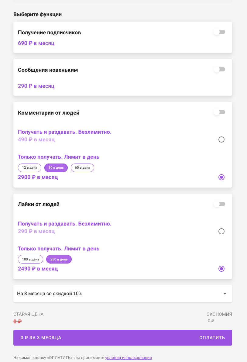 Сервис не бесплатный, у него есть разные тарифы. Можно оплатить отдельные функции, которые вам нужны. Например, массфолловинг или накрутка лайков и комментариев.