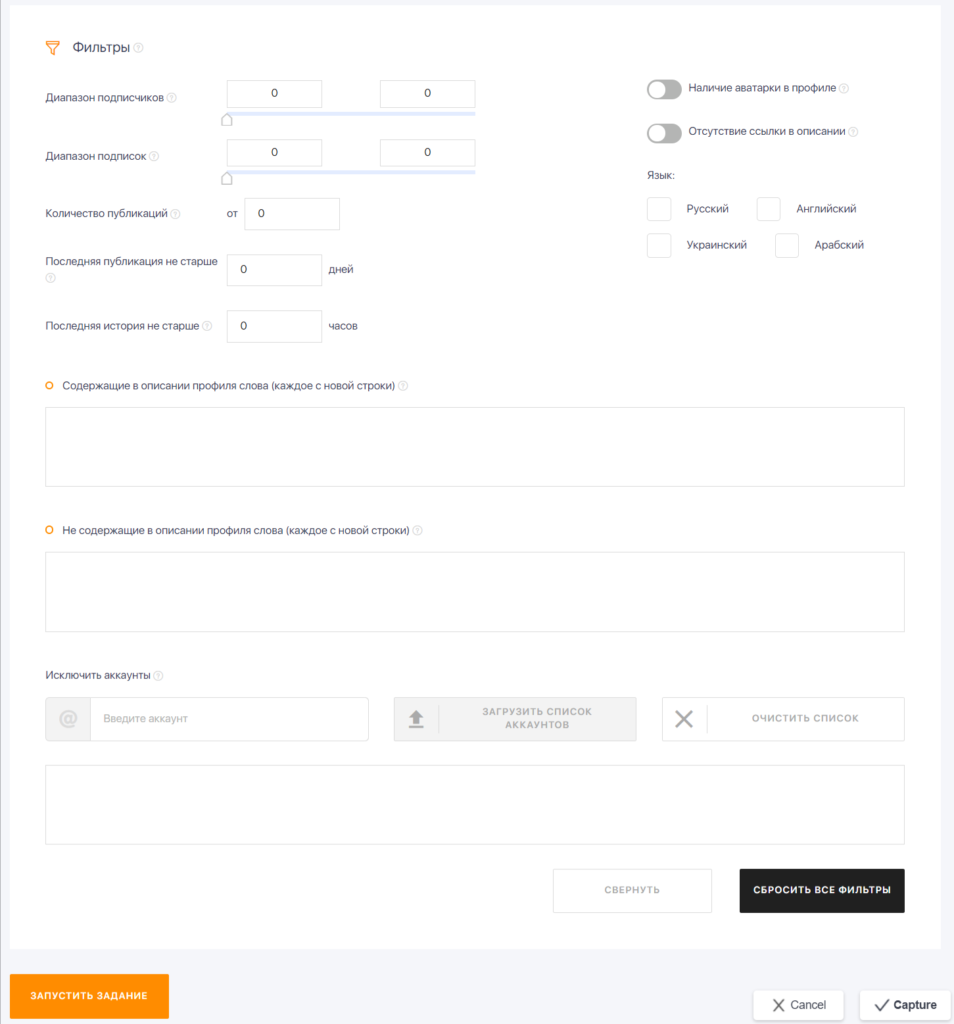 - строки для фильтрации — список стоп-слов, убирающий ненужные вам описания в аккаунте пользователя.