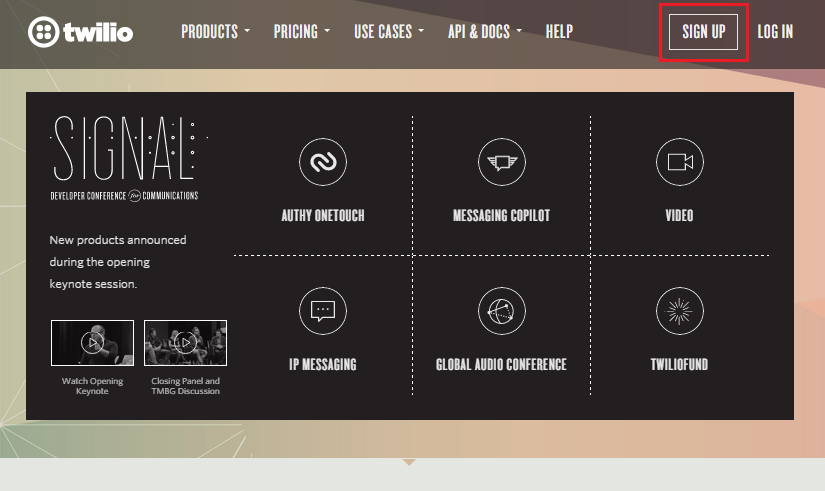 Чтобы пользоваться Twilio, придется зарегистрироваться на сайте. Для этого кликните кнопку «Sign Up».