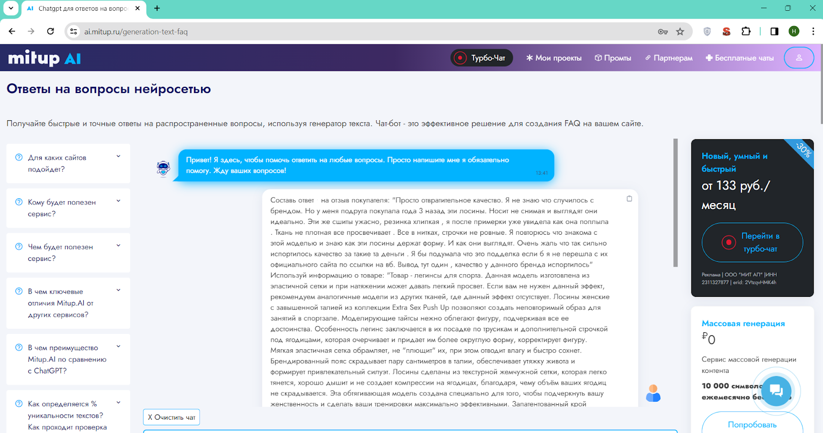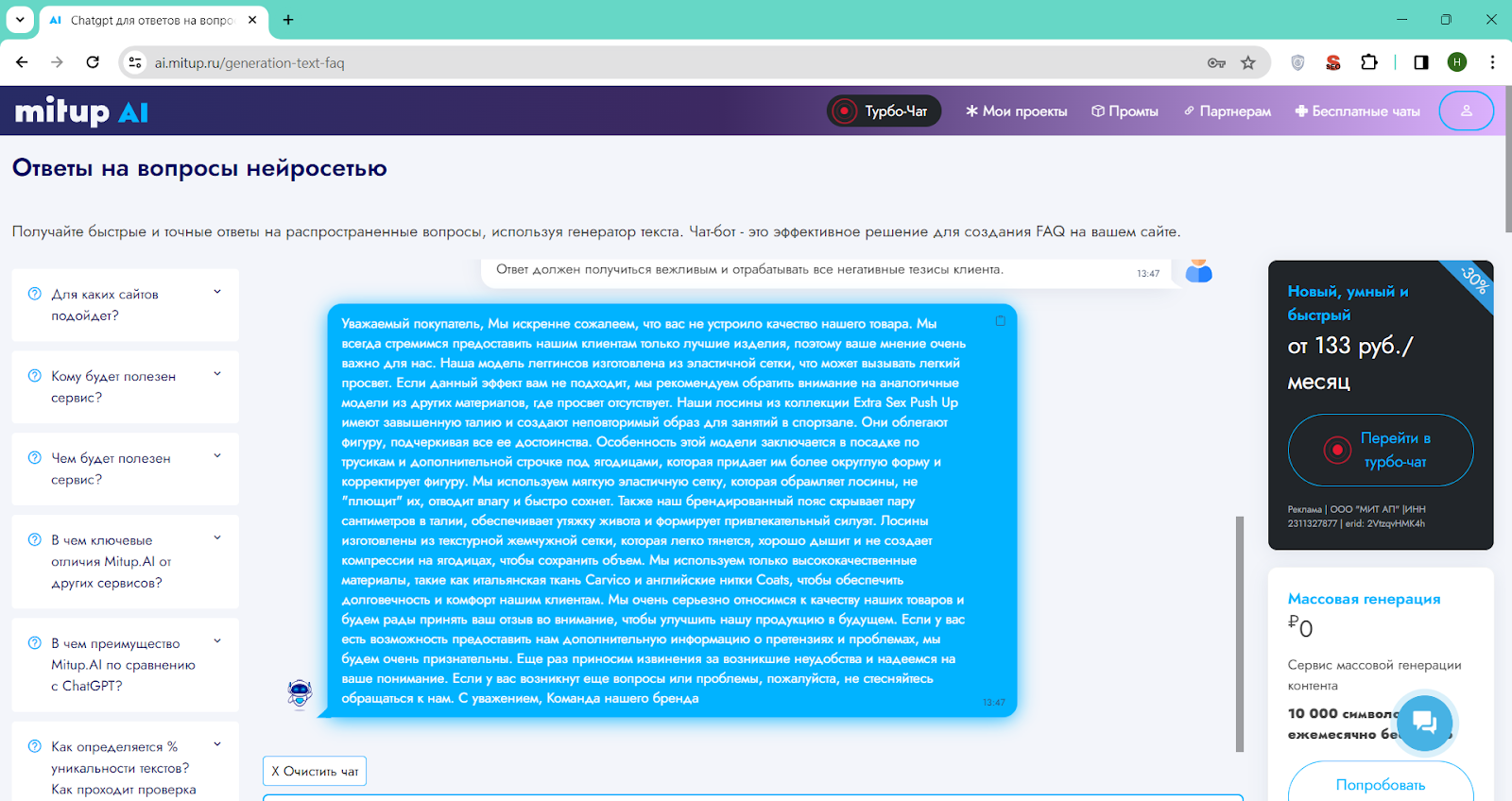 Для примера мы взяли негативный отзыв с маркетплейса, информацию о товаре из карточки и попросили нейросеть составить ответ: