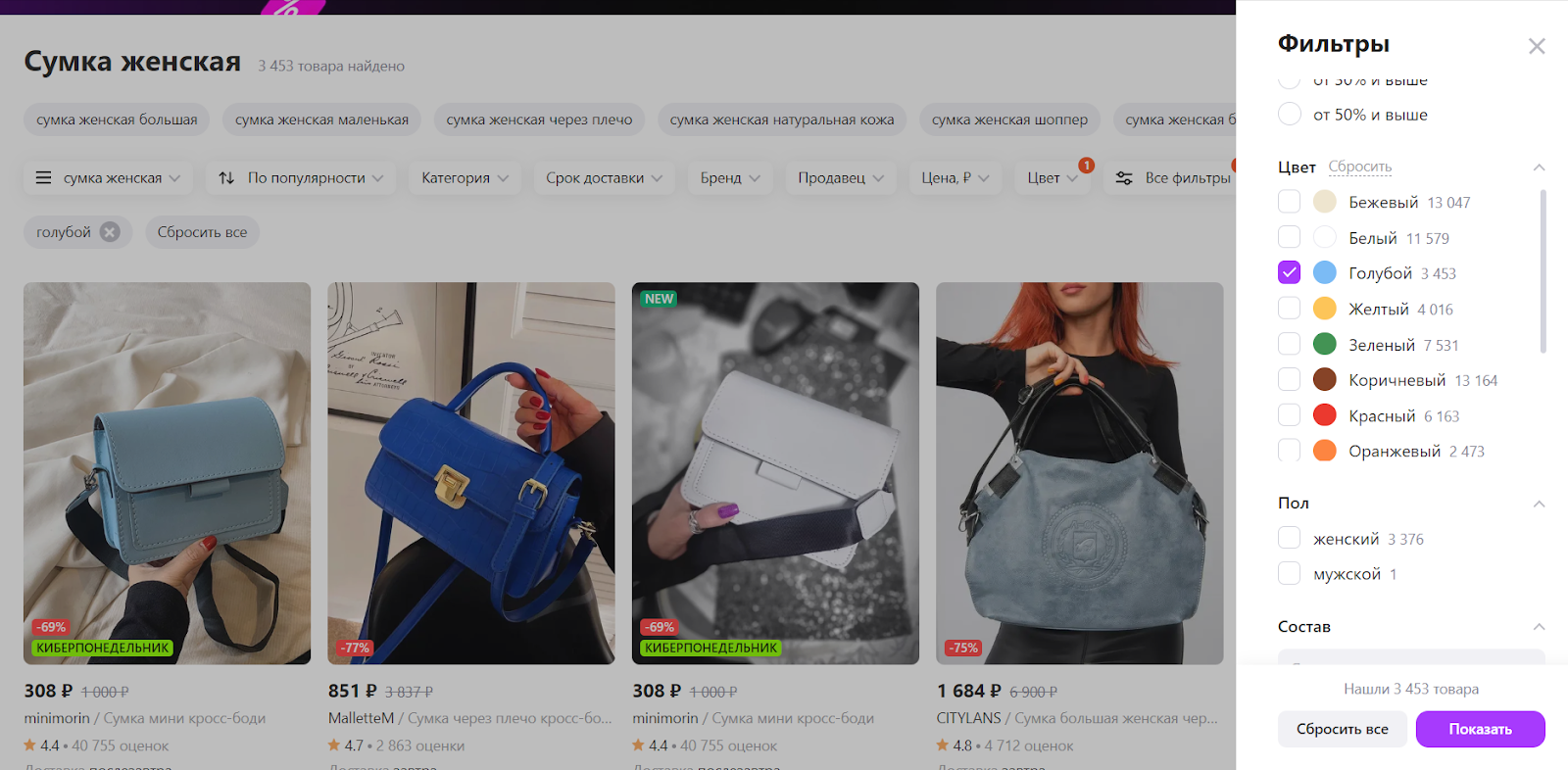 Еще один важный момент для оптимизации карточки – фильтры маркетплейсов, с помощью которых можно уточнить параметры товара и сократить область поиска.