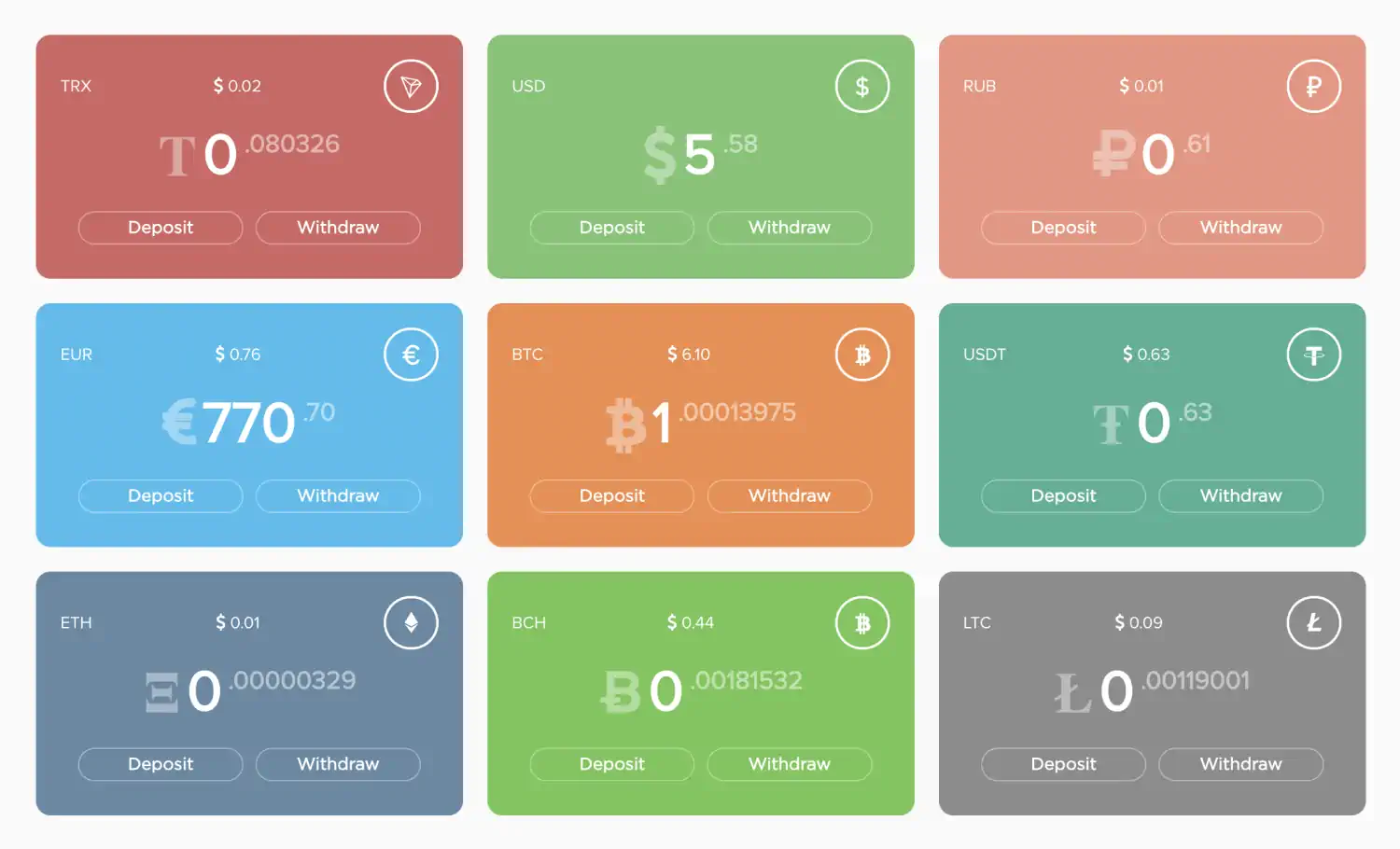 Как я уже и сказал, этот кошелек позволяет использовать не только обычные рубли или долларры. Здесь можно полноправно использовать биткоины, эфир и прочие криптовалюты.