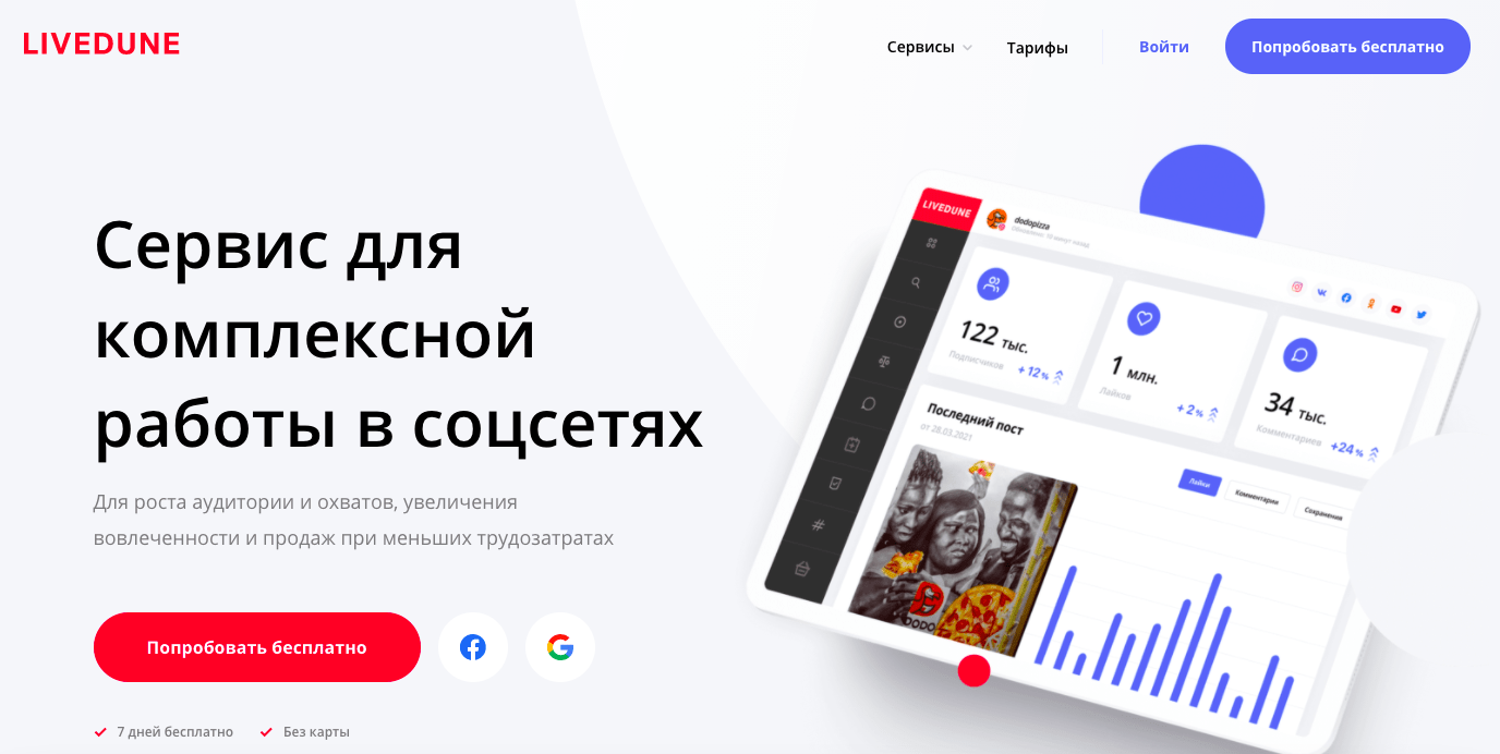 Еще один отечественный сервис, позволяющий управлять социальными сетями. Он существует на рынке с 2014 года. LiveDune по аналогии с предыдущим сервисом работает со всеми популярными социальными сетями. Помимо отложенного постинга, с его помощью удается проанализировать статистику аккаунтов (как личных, так и конкурентов). Есть возможность выгрузки аналитических отчетов в любом удобном формате (в частности, XLS, PDF), установки KPI для каждого аккаунта, совместной работы с командой до 5 человек. Стоит отметить, что сервис предоставляет намного больше информации о страницах по сравнению со стандартной статистикой в Instagram*. Это требуется всем, кто ведет бизнес-аккаунты: блогерам, предпринимателям, которые продают свои товары и услуги, авторам собственных проектов, SMM-специалистам.