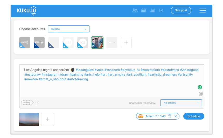 Как только вы закончили с подключением, вы готовы создавать и публиковать отложенные посты. В KUKU.io вы можете планировать посты в Instagram одновременно с постами в другие соцсети