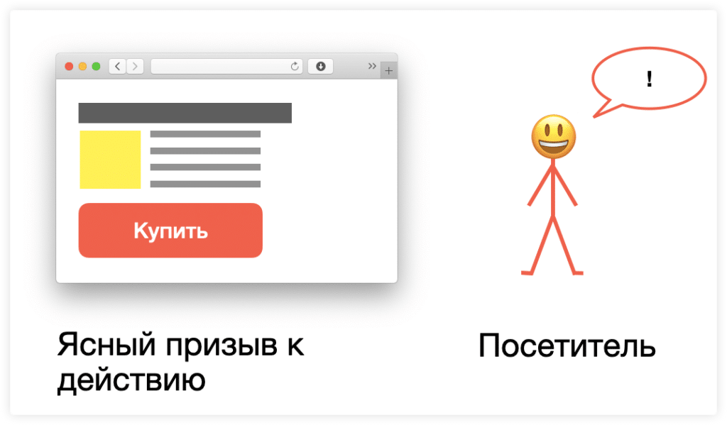 Если сайт не только четко говорит о товаре, но и дает однозначное понимание того, как его купить, вероятность конверсии возрастет многократно. Посетитель получит то, что ему нужно, а вы получите клиента. Все счастливы.