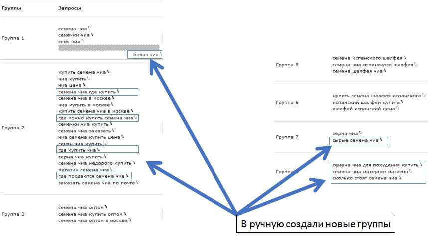 После автоматической кластеризации вручную перенесли некоторые запросы из одной группы в другую, некоторые объединили вместе и в итоге сформировали единую группу запросов, по которым и будет продвигаться наш лэндинг. Для проведения этой работы использовали логику, рекомендации заказчика и анализ поисковой выдачи.